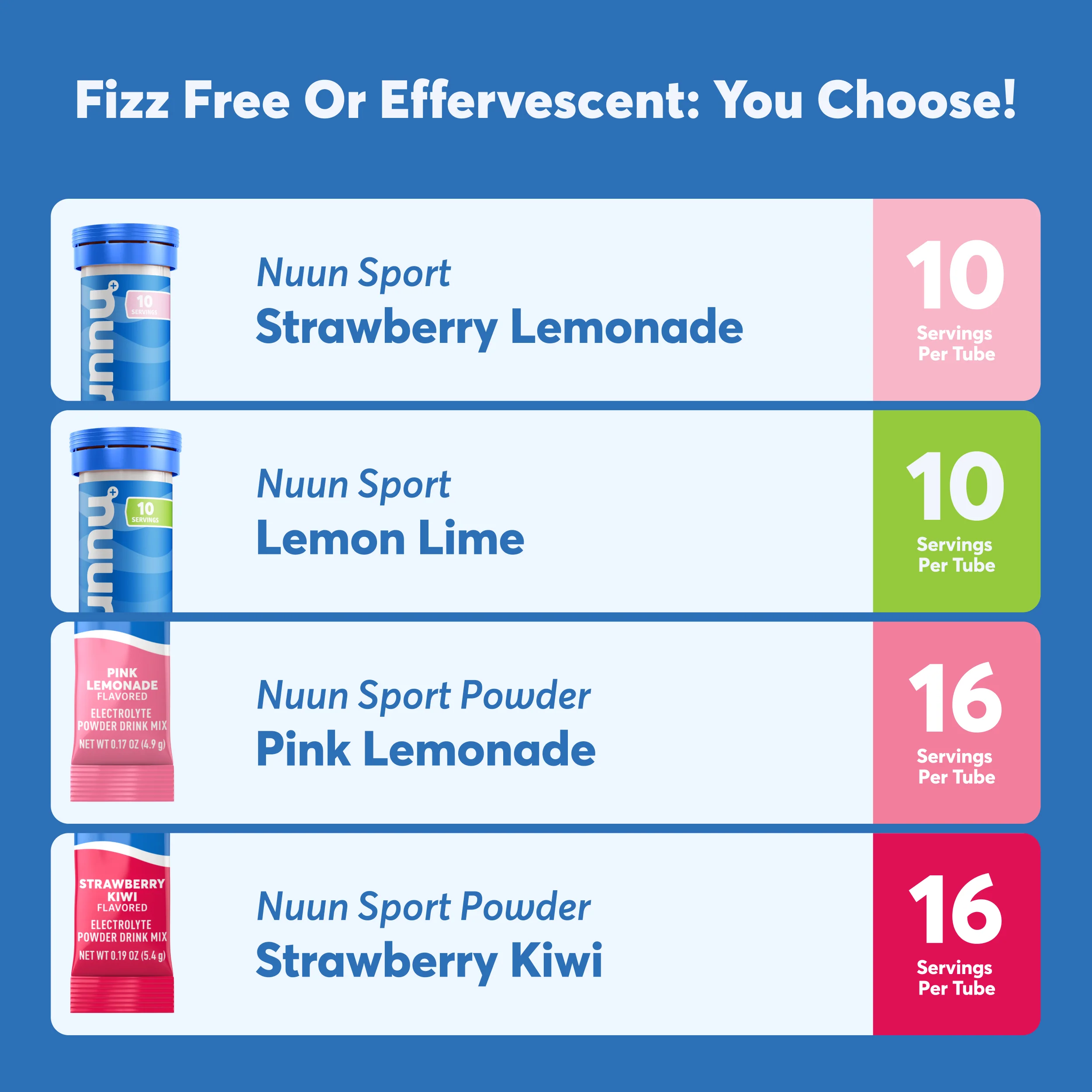 Is Nuun fizzy or non-fizzy? The answer is: both! Mix up your hydration habits with two refreshing flavors each of Nuun Sport powder (still) and Nuun Sport tablets (sparkling). Shop this bundle at 15% off compared to the cost of purchasing individual tubes.